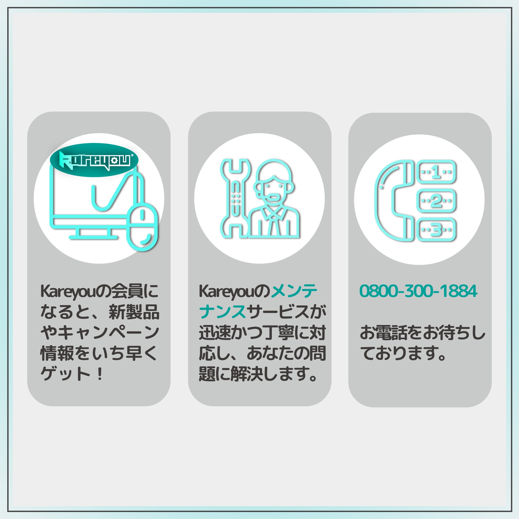 【入会方法】ホームページ右側メニューの『会員登録』より簡単にご登録 故障診断から修理・部品交換、 使い方のご案内やメンテナンスまで、 安心してご利用いただけるサポート体制を整えております。 Kareyouでは、専門のメンテナンスチームが迅速かつ丁寧に対応致します。