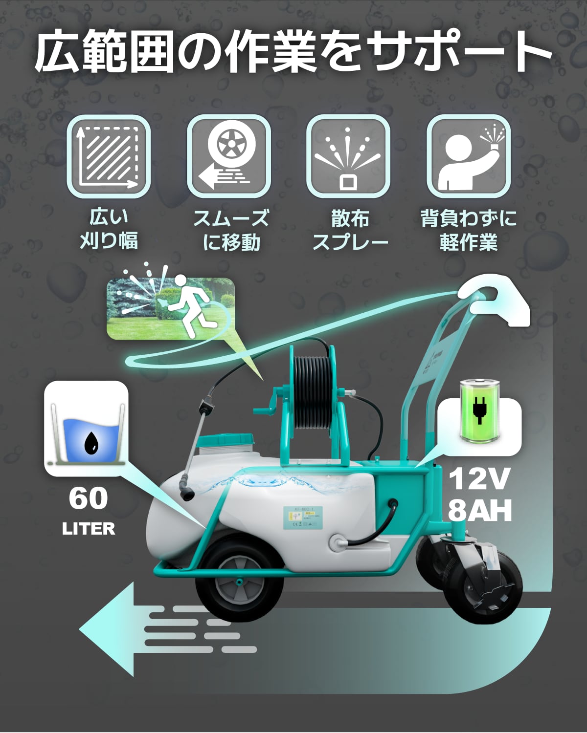 噴霧器 バッテリー式噴霧器 10 Mpa 60L 静音 流量6.0L/min 農業用 除草 防除 消毒 50mホース リール付き リチウムバッテリー充電式 家庭菜園