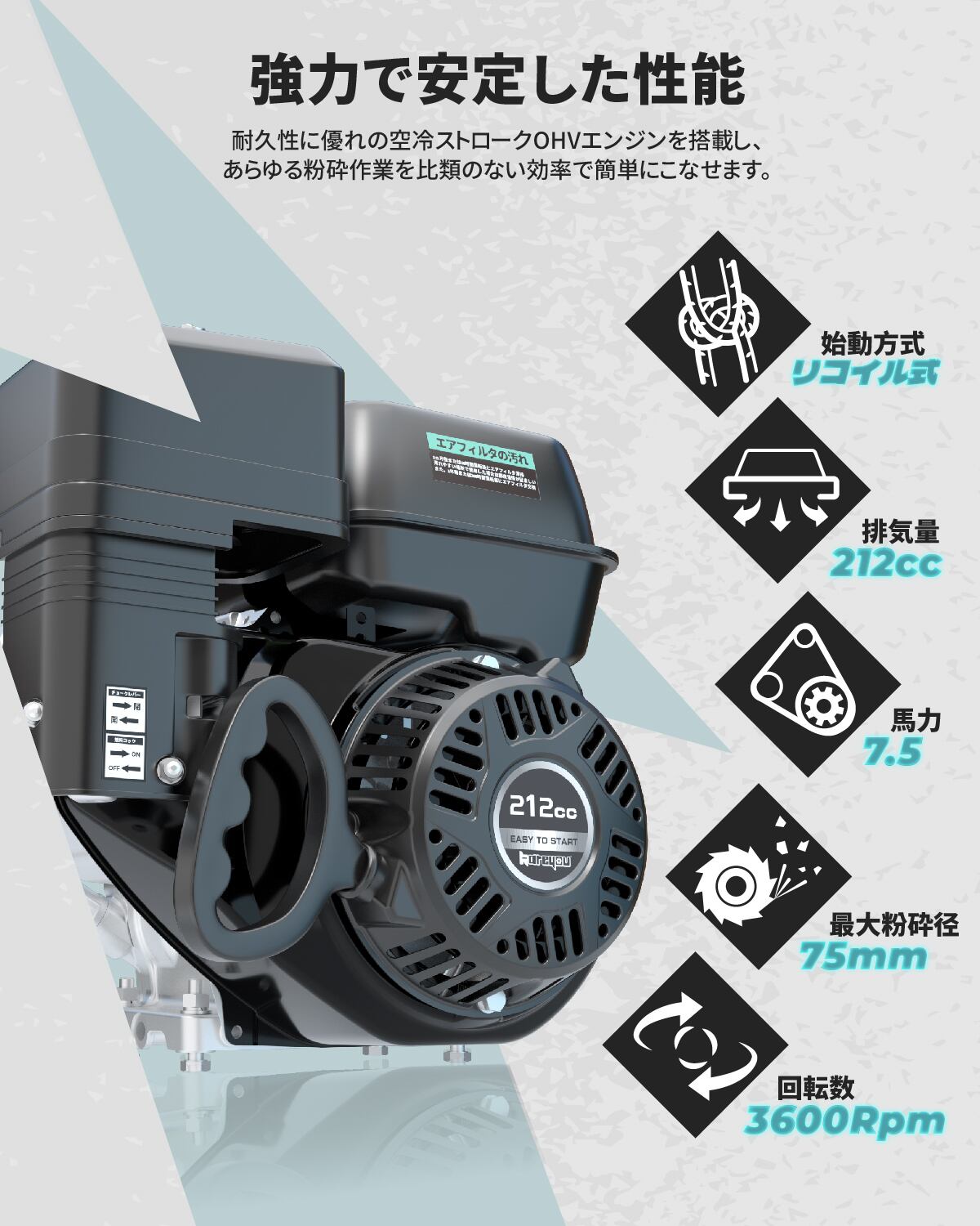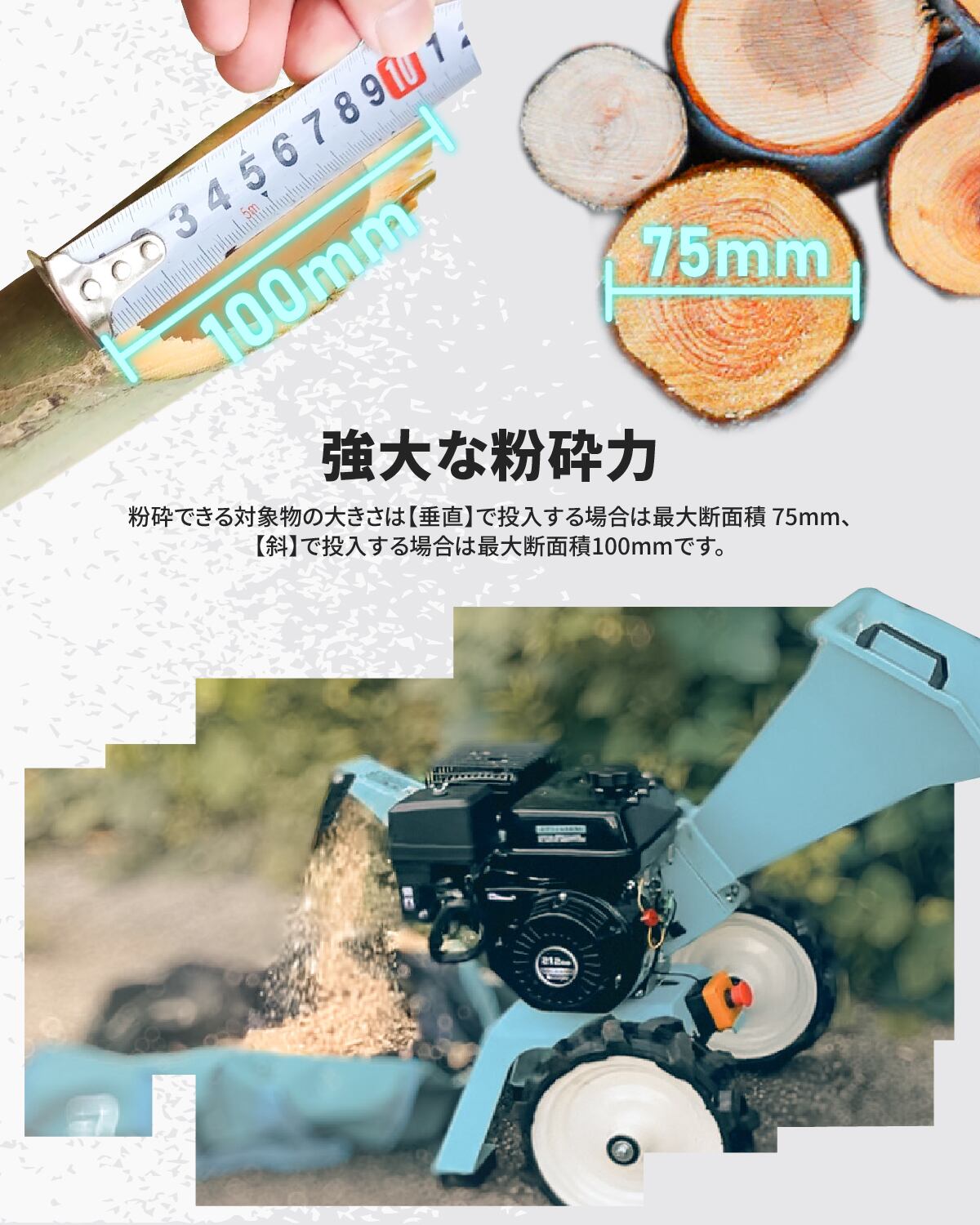 【2024年NEW小型ウッドチッパー】木材、枝、竹、などが楽々粉砕でき、竹や木材を粉砕するのに最も効果的なエンジン粉砕機。超強力7.5馬力エンジン搭載し半自動粉砕機能実現可能です。竹は最大75mm粉砕でき、断面100mm粉砕可能(実測値)。木材の最大粉砕75mm可能で農業、造園業、果樹園業、各自治体はもちろん、一般ご家庭や小学校など公共機関でも大活躍!