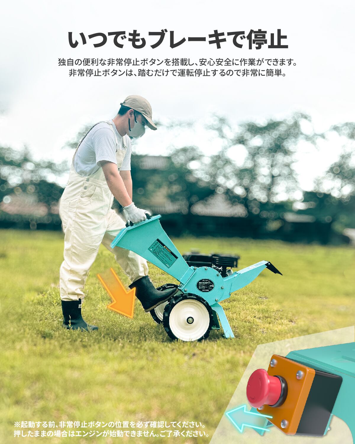 【足踏み式緊急停止ボタン付き】エンジン粉砕機COY-704M本体は安全ボタンが付いて非常時に踏むと止まりますが※再起動する場合は必ず安全ボタンをリセットしなければなりません。投入口には飛散防止用のゴム皮が装着されており、粉砕時にも飛散しません。