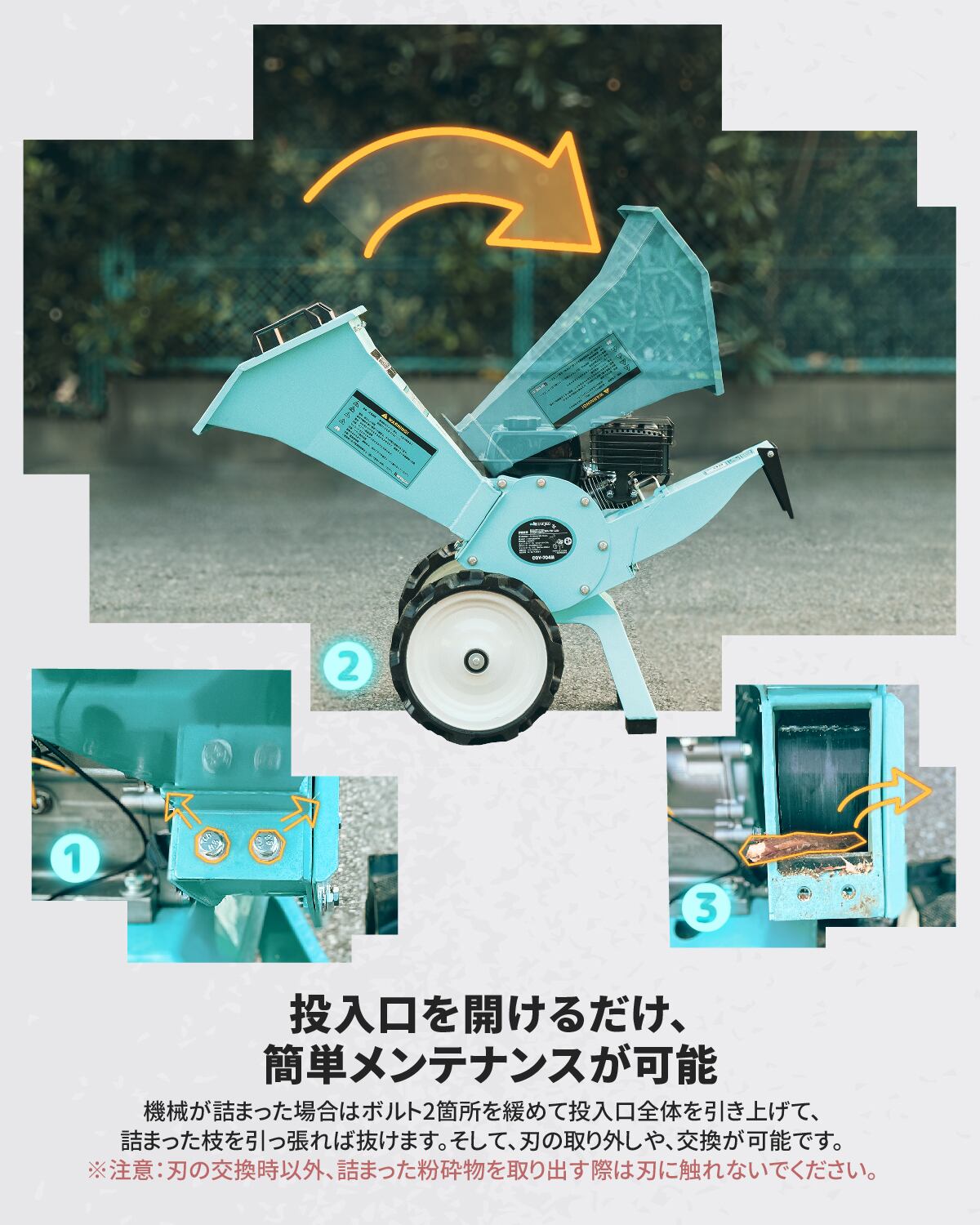 【ポータブルで取り外し可能で、メンテナンスが便利】 エンジンウッドチッパーCOY-704M本体は組み立てる必要があり、旧型粉砕機とは異なり、本体を取り外すことができましてブレードを交換して残留材料をクリーニングする方が簡単です。