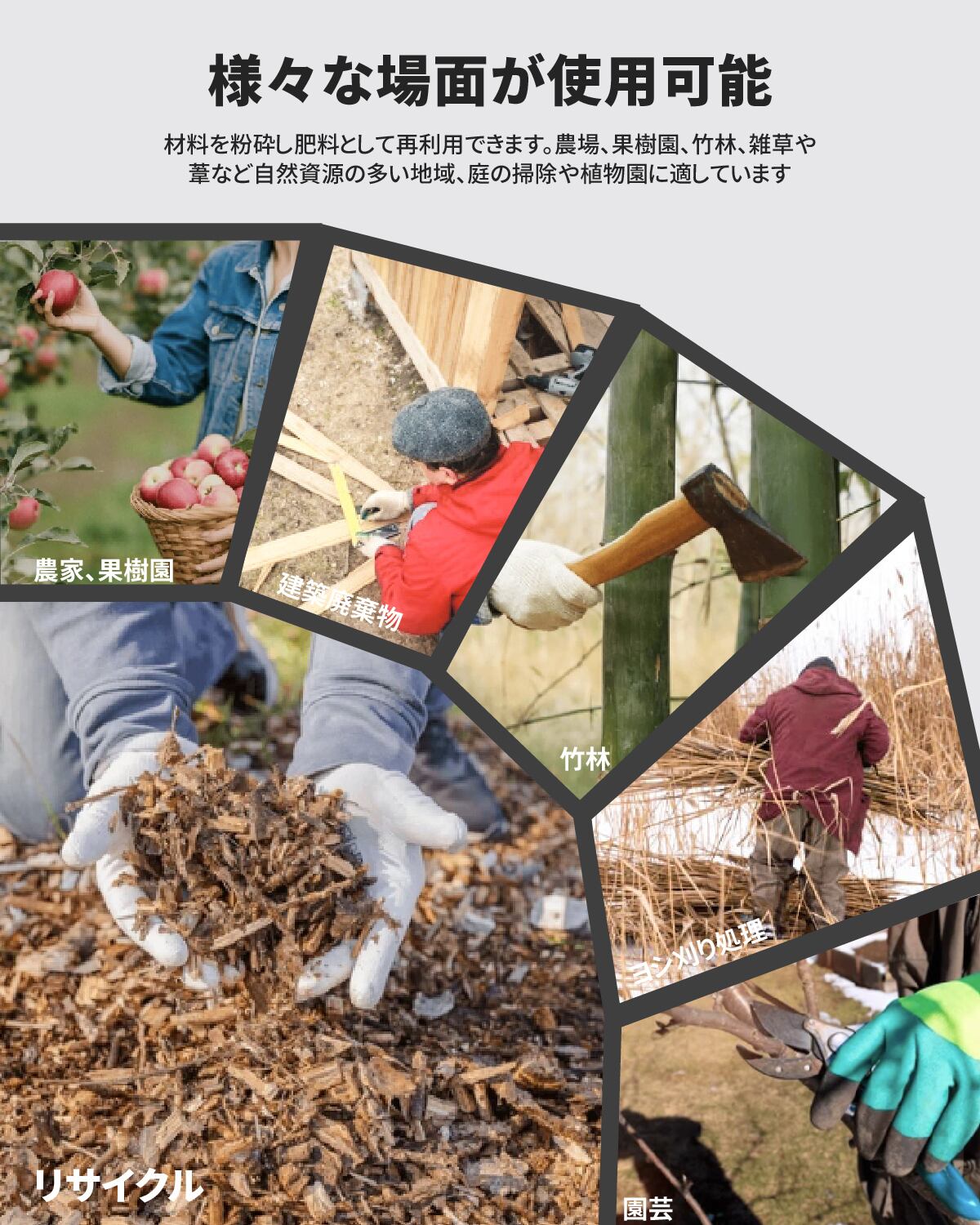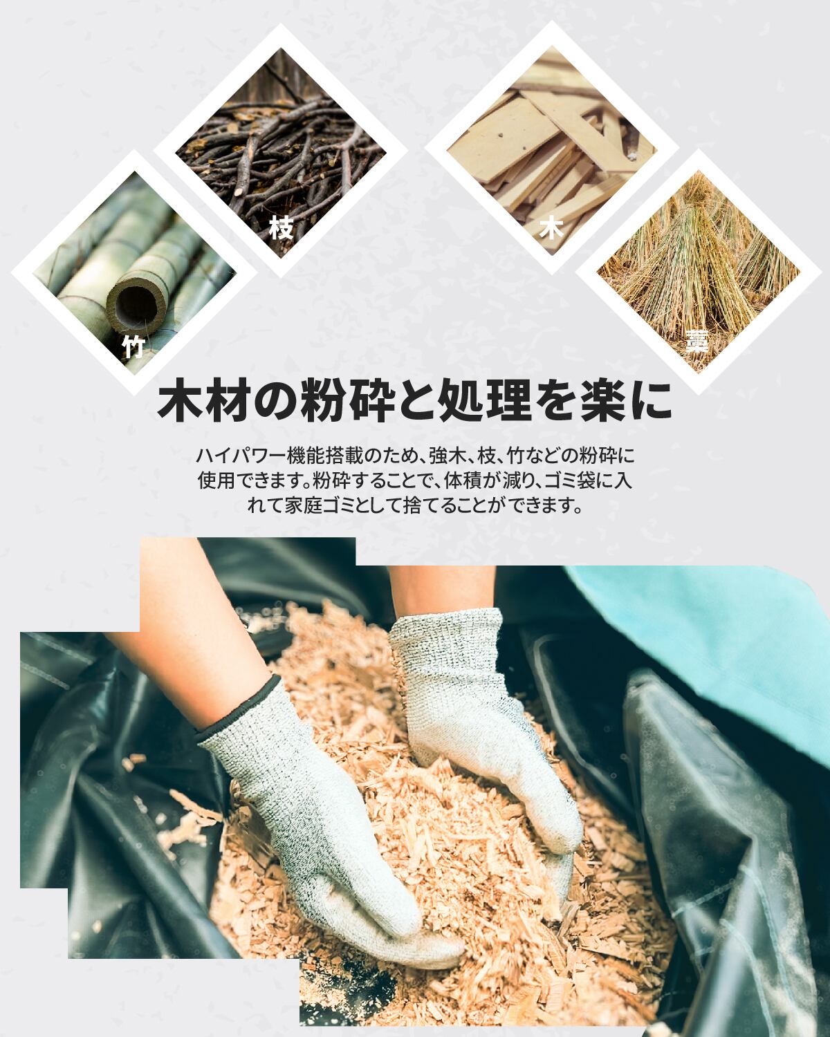 【家庭ゴミとして処理可能】粉砕能力は優秀で、投入した木材はあっという間に細かなチップ状になります。可燃ごみとして出すことは可能になり、野焼き禁止の難関を突破します!農業、造園業、果樹園業、各自治体もちろん、一般ご家庭や小学校など公共機関でも大活躍!